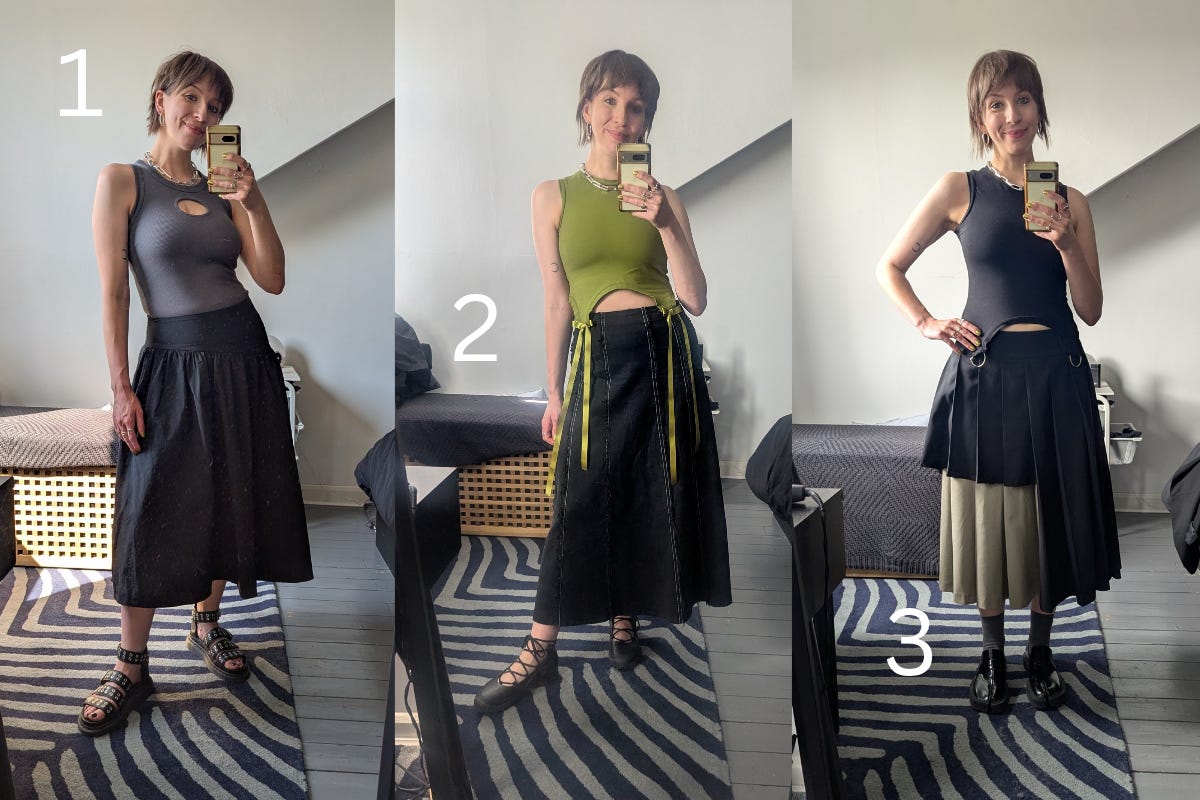 ’s three word method. I read and followed the tasks of Allison’s book, Wear it Well, early last year and it’s taken me almost this long to settle on a combination of words that speak to me and my wardrobe. I’m still not sure I’ve got the balance right. But what I do know is that if an outfit feels off, it’s likely missing one of my words. And the best outfits? They lean the hardest into all three:Dark: Word one is for your regulars, the things that you reach for day in, day out. This was actually the hardest word to settle on. It almost feels a bit boring, too safe, but I feel at my most confident when wearing a dark palette, or having at least a strong dark base to my outfits.